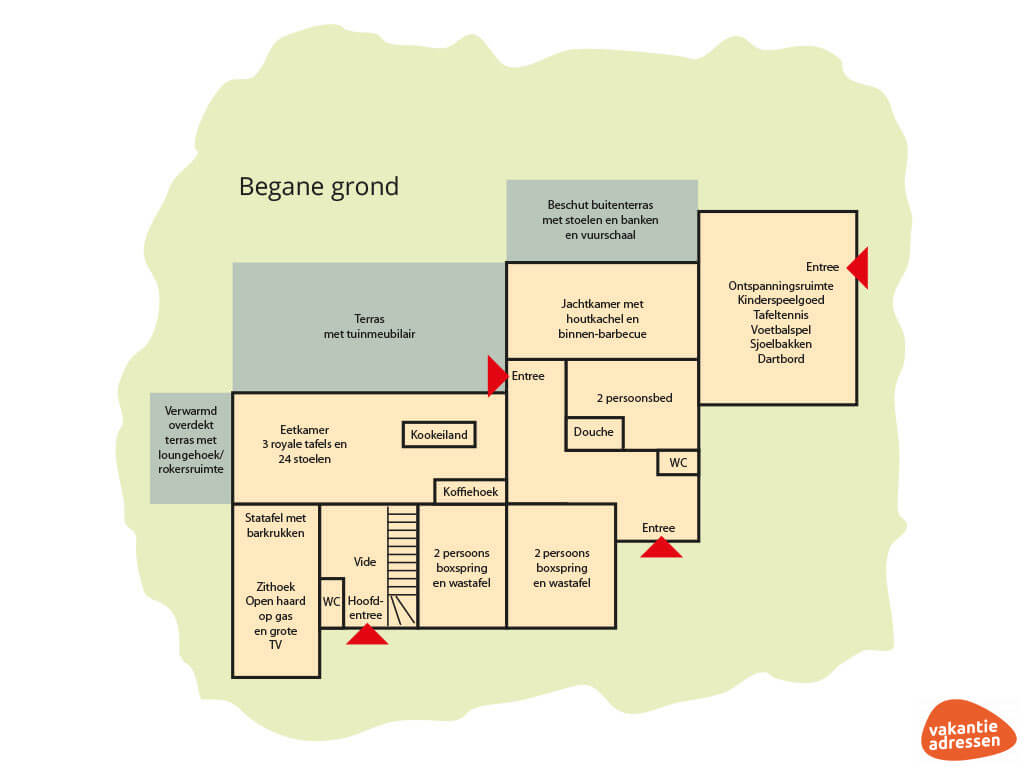De riante vakantiewoning is geschikt voor maximaal 24 personen en heeft 8 slaapkamers (alle slaapkamers hebben een naam en zijn voorzien van Limburgse wandteksten "Sloap lekker woh" of "As ge nie kunt sloape, dan makte gewoan de lamp uut") en 2 luxe en zeer ruime badkamers met bad en douche. De moderne en compleet ingerichte open keuken is van alle gemakken voorzien zoals een kookeiland, 2 koelkasten met vriezers, 1 magnetron, 1 combioven en vaatwasser. Samen kokerellen is een genot met prachtig uitzicht op onze tuin. Aangrenzend aan het kookeiland staan de stoere tafels met heerlijke stoelen. Ook hangt er een TV bij dit zit/eet gedeelte. We passen de tafelopstellingen aan, aan het aantal gasten. Voor de kleintjes hebben we 2 kinderstoelen en een box. In het lage zit gedeelte staan heerlijke banken en Love Seats met een tweede tv en open haard. In de gezellig ingerichte serre is het heerlijk zitten en deze mag ook gebruikt worden als "overdekt roken".