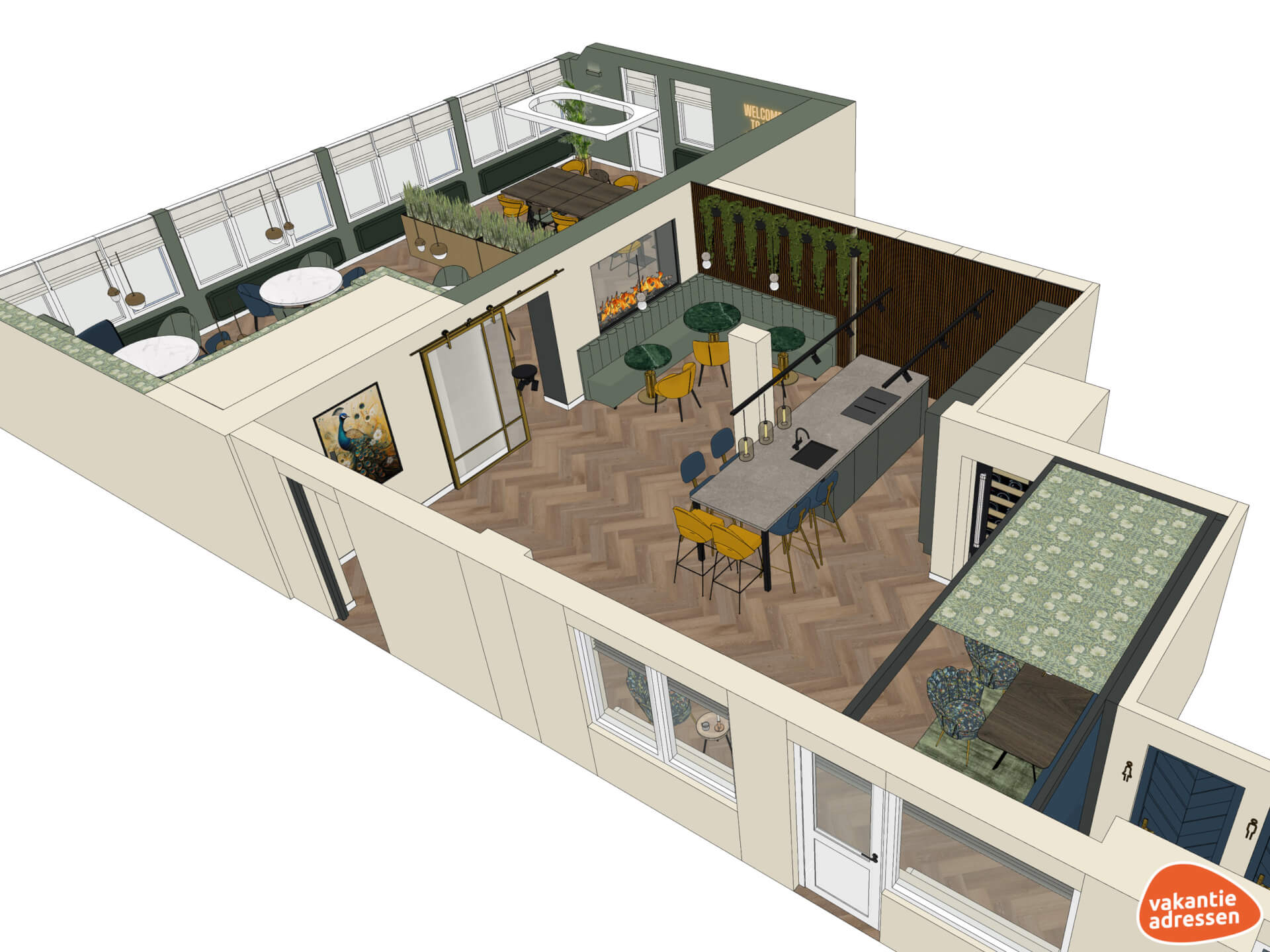 De grote leefruimte, met als stralend middelpunt een grote elektrische waterdamp doorkijkhaard, kun je voor meerdere doeleinden gebruiken. Er is een gezellige zithoek met banken waar je samen kunt ontspannen en kijkt naar de rest van de groep die aan de tafels een spelletje spelen. In de open keuken is een prachtig kookeiland en leent zich uitstekend voor gezellige maaltijden en culinaire hoogstandjes. De comfortabele stoelen aan de eettafels nodigen uit tot uitgebreid dineren en natafelen, terwijl de kinderen zich urenlang vermaken in de ontspanningsruimte met tv, playstation, wii, pooltafel en darts, een perfecte chill-plek! Alsof dit nog niet genoeg is, beschik je ook over luxe voorzieningen zoals fitnessfaciliteiten en een wellness met sauna en bubbelbad, voor extra momenten van ontspanning. Zowel de fitness- als wellness kun je optioneel tegen meerprijs bijboeken (voor prijzen zie het boekingsformulier).