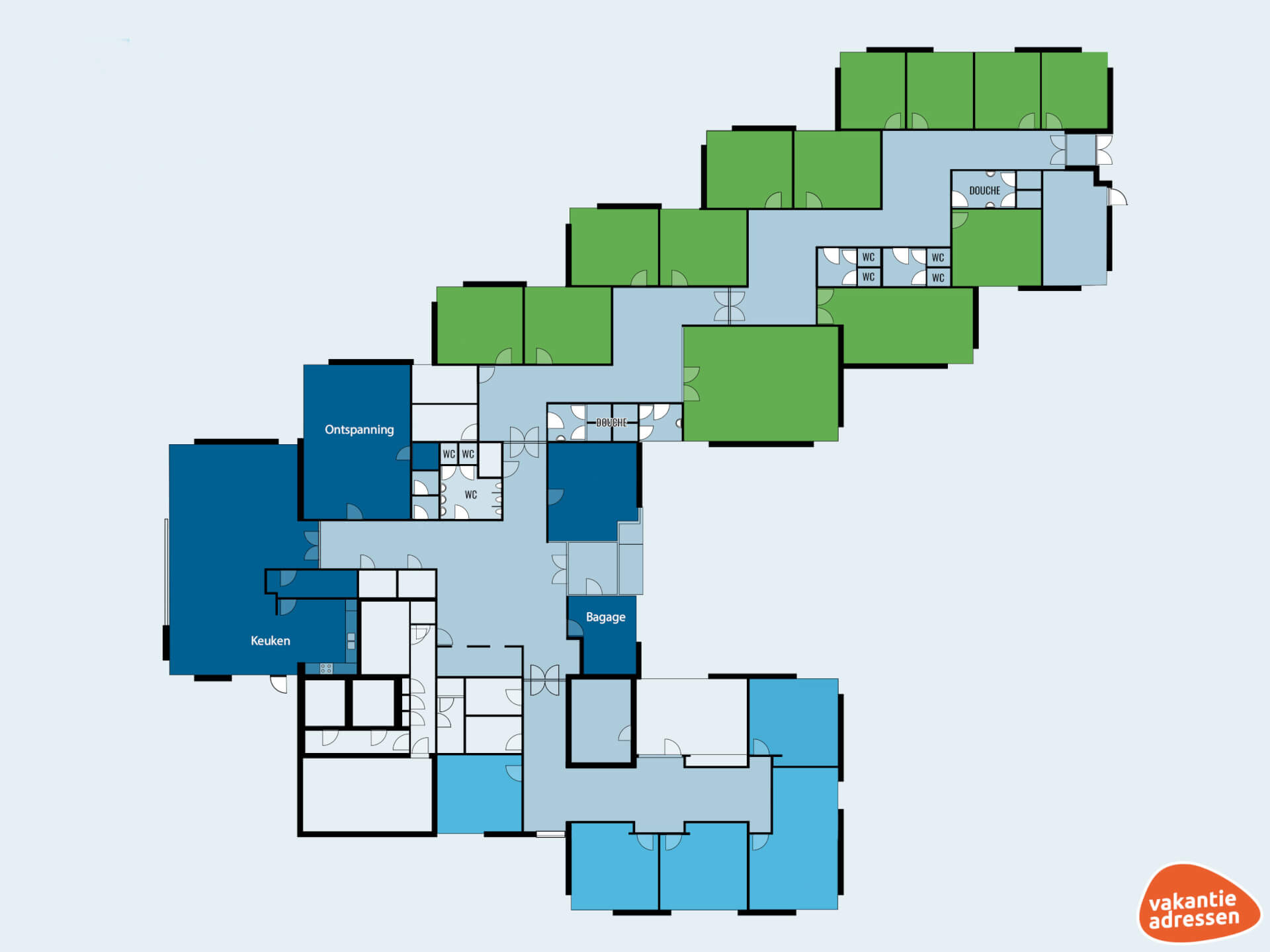 De groepsaccommodatie biedt een gevarieerde indeling van slaapkamers, waaronder slaapkamers -met bureau en stoel- voor 2, 3, 4 of 5 personen met luxe boxspringbedden, evenals slaapzalen met stapelbedden voor grotere groepen. Alle kamers bevinden zich op de begane grond, hebben per bed een eigen lockerkast en zijn comfortabel ingericht, zodat iedereen na een drukke dag heerlijk tot rust kan komen. Er zijn bovendien voldoende gemeenschappelijke badkamers en toiletten beschikbaar, zodat iedereen zich rustig klaar kan maken voor de gezellige dag of de ontspannen nacht.