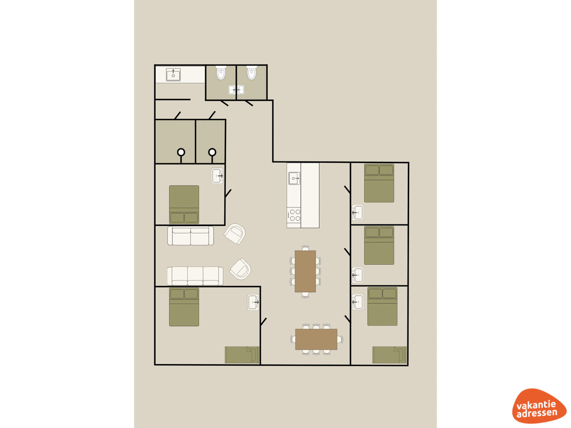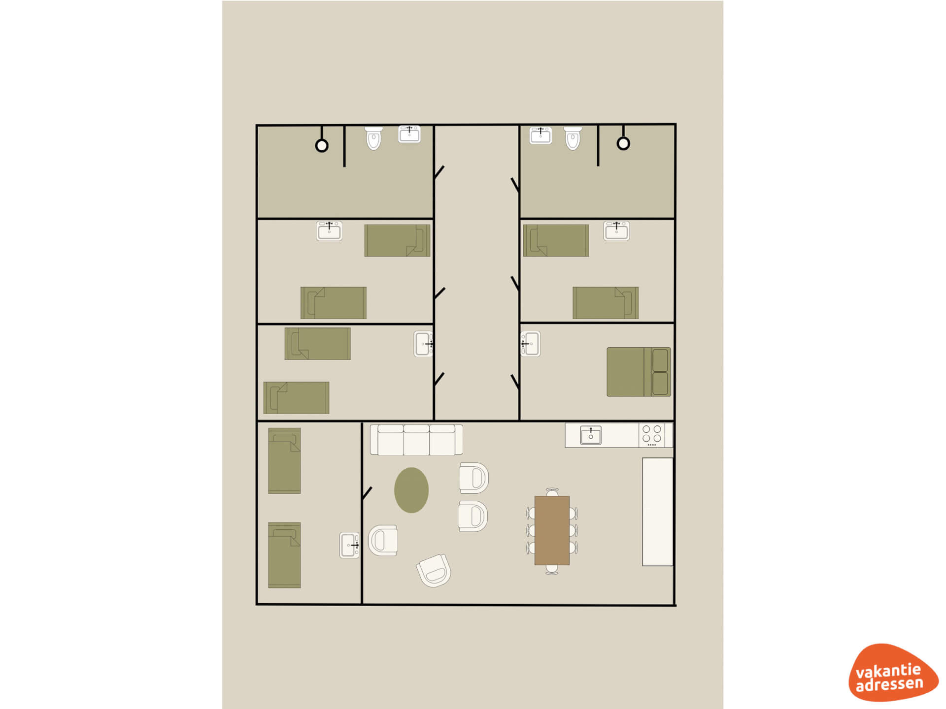 Alle vakantiehuizen beschikken over ruime slaapkamers, met comfortabele bedden en voldoende privacy voor ieder gezelschap. Vakantiehuis 1 is met 5 slaapkamers, 2 douches en 2 toiletten geschikt voor 13 personen. Vakantiehuis 2 bestaat uit 2 verdiepingen en biedt ruimte aan 10 personen met 4 slaapkamers, 2 douches en 2 toiletten. Vakantiehuis 3 beschikt over 2 doucheruimtes, 2 toiletten en 5 slaapkamers voor 2 personen, waarvan 2 met een hoog-laag bed. Zo geniet iedereen van genoeg ruimte en gemak.